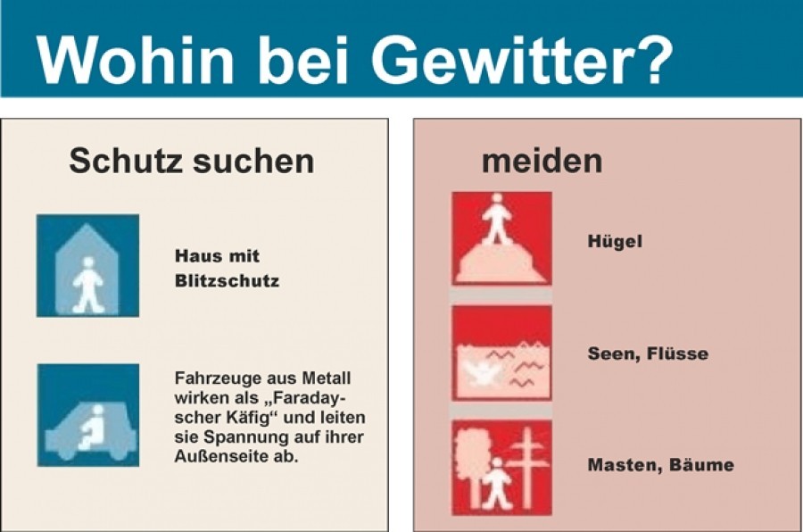Schutz in Gebäuden oder Fahrzeugen suchen – Fahrzeuge mit geschlossener Metallkarosserie und viele Gebäude mit einem Blitzschutzsystem wirken wie ein Faradayscher Käfig und bieten so Schutz vor hohen elektrischen Feldstärken.